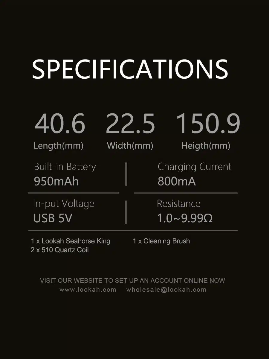 Compatible with five Lookah dab tips and universal 510 threads, the Seahorse King works with various cartridges and accessories.