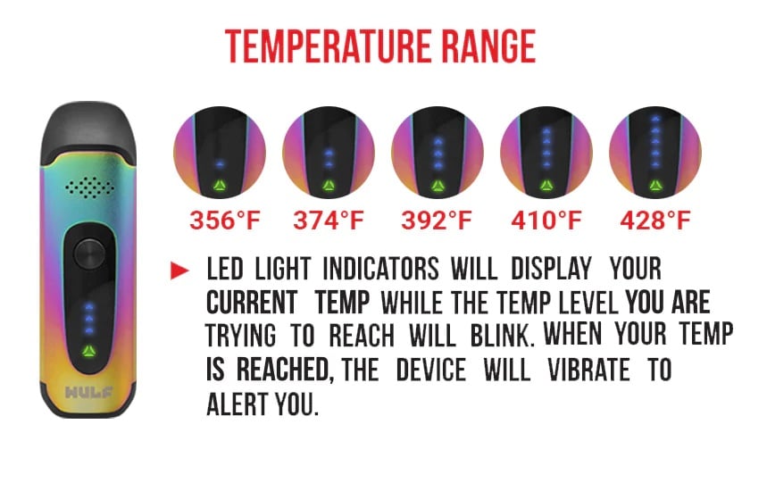 To start the device, press on the power button 5 times rapidly in a row. Note, if you don’t click on the power button quickly enough the device won’t register the action and won’t work. Once the device is on, to navigate click the power button 2 times in a row to change to the temperature of your choosing. Bright LED light indicators will go off in occurrence to the temperature level from 356° to 428°.